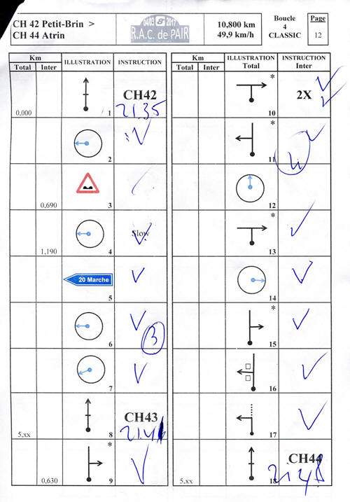 Voorbeeld van Routeblad met sectie CH 42 naar CH 43 van 6 minuten en van CH 43 naar CH 44 van 7 min. Lijkt eenvoudig maar is zeer pittig !!!!